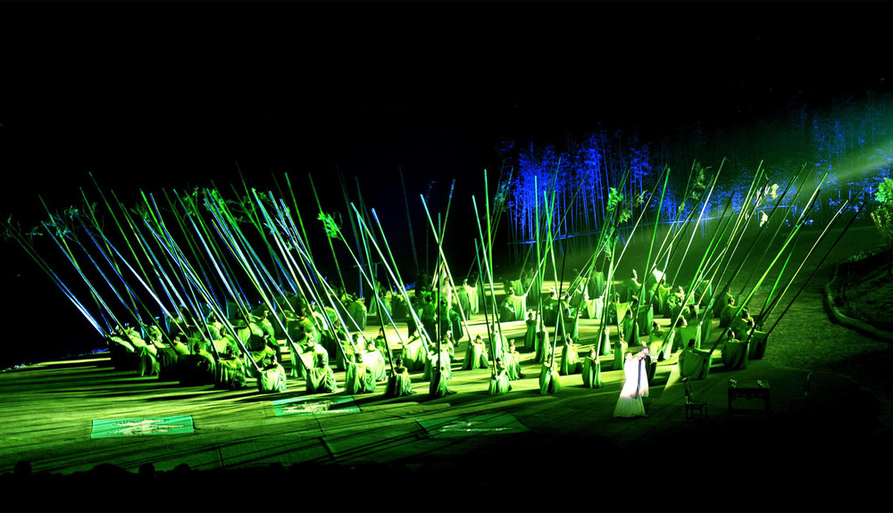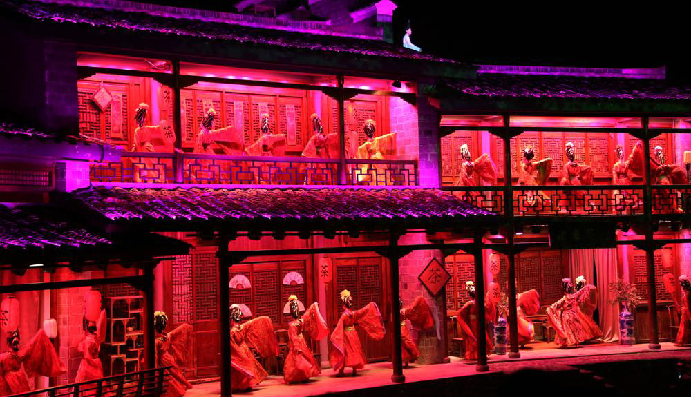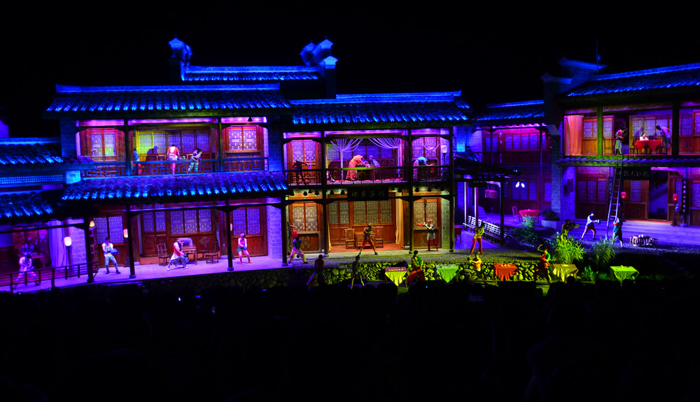 由420名武夷山当地民众参与演出的《印象·大红袍》山水实景演出,宣称“转着看演出”,“实景电影”和360度旋转观众席是其最大的看点。演出舞台坐落在武夷山国家旅游度假区武夷茶博园西南角、崇阳溪东+侧河岸,背倚风光绮丽的武夷山水。演出以茶楼的胖老板与朋友们聊天为开场。随即观众席开始朝着“印象茶馆”的方向旋转,众多唐代仕女出门迎客,近百位演员的低胸装竟然克隆自《满城尽带黄金甲》!当舞台来到一片空地时,“竹林大战”顿时上演:几十位绿衣少年每人擎起一根人工竹子构成竹海,两位一身白衣的“诗人”被威亚吊到竹林上空飞舞,俨然《十面埋伏》加《英雄》;当舞台旋转至“印象茶馆”时,《三枪》里的“麻子面馆”老板又现身了……